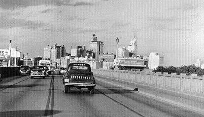 Dallas skyline from the Trinity River bridge coming from Oak Cliff circa 1950’s