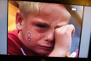 I almost feel bad using this picture, but I think the thing that makes it OK is that it calls attention to what must be going on in this tot’s home in order for him to be taking this loss so hard. Either he’s Stoop’s kid or he’s thinking “Now Daddy’s gonna beat Momma up like he did the last time the Sooners lost.”