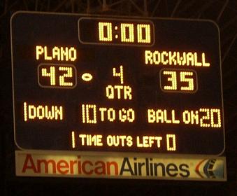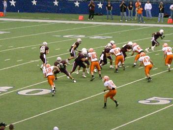 When playoff time hits, coaches call their next opponent and work out a neutral site for the playoff matchup. Sometimes it’s halfway between two towns. Some coaches are gamblers and will flip a coin and play at home if they win or the other team’s home stadium if they lose. Needless to say there is a scramble to get one of the better stadiums in the area for playoff games. In Dallas that means one thing….Texas Stadium. Home of the NFL Dallas Cowboys. They start them early and run games every three hours, shuttling fans in and out. The venerable (and soon to be obsolescent) stadium holds ~65,000 folks and there are usually anywhere between 15 & 25 thousand in at any one time. It’s a treat for the kids, if a bit of a hassle for the adults. From a fan perspective it’s a bargain. You can buy one ticket and watch all you care to watch, assuming you have the cashish to live of $5.50 sodas and $8.50 nachos all day.